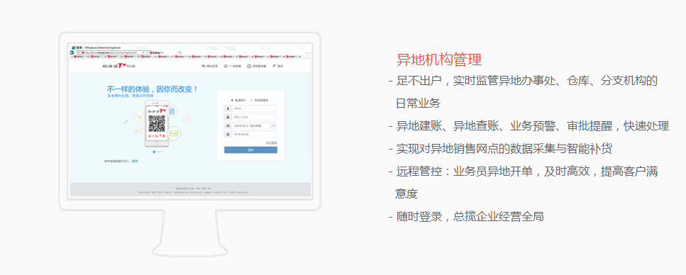 在满足企业本地业务管理需求的同时,还可帮助企业进行异地仓库、办事处、门店、分支机构的远程管控。